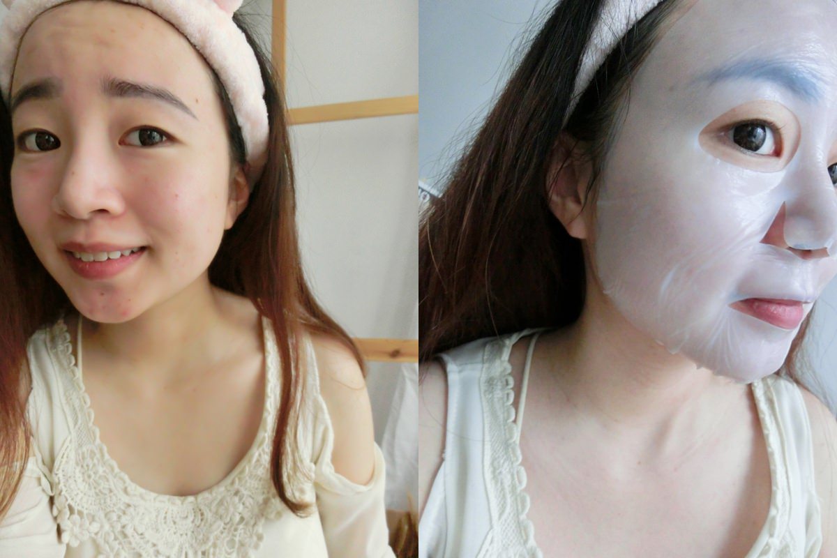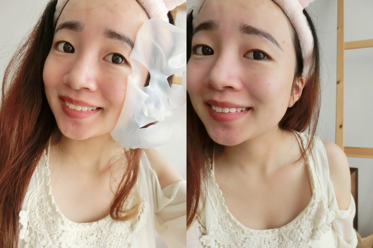 左圖是敷面膜前的肌膚狀況,蕾舒翠 玻尿酸水動能面膜讓小荻很喜歡的地方就是面膜的服貼度,相當服貼之外又很好調整位置,摸起來有點果凍Q彈的感覺。